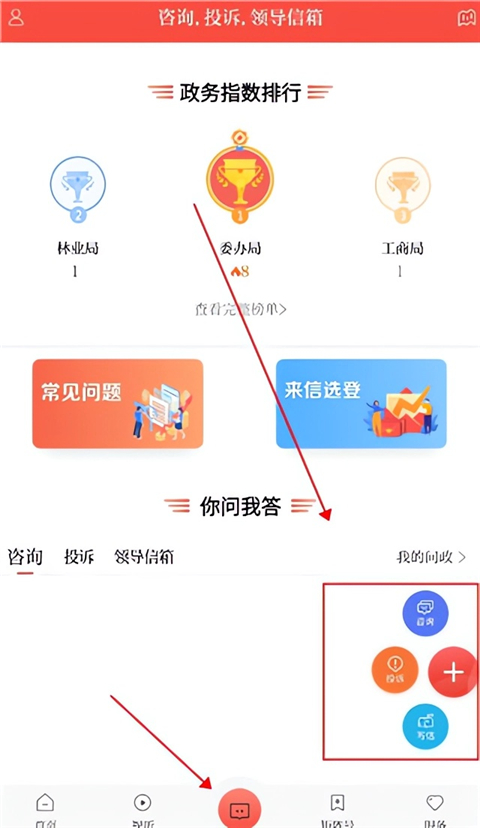3、大家遇到不公的事情,想要投诉建议,可以点击正下方消息图标,然后点击加号选择你投诉、咨询的方式