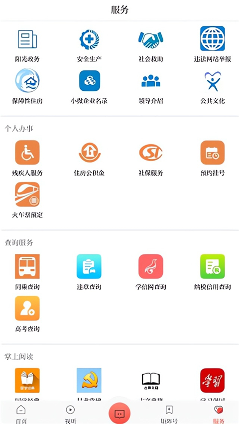 1、党务服务 党建云、党建网、党费计算器、党费 2、行政服务 文件搜索、学历证书、产品质量、旅游投诉 3、生活服务 交通违法、报刊订阅、快递查询、在线翻译、飞机票 4、云社区 e代驾、发票查询 5、缴费服务 电费、水费、有线电视、手机充值、流量充值、团费智慧靖远app使用教程