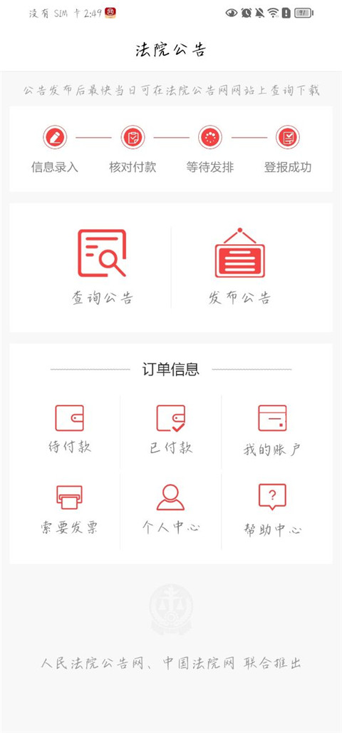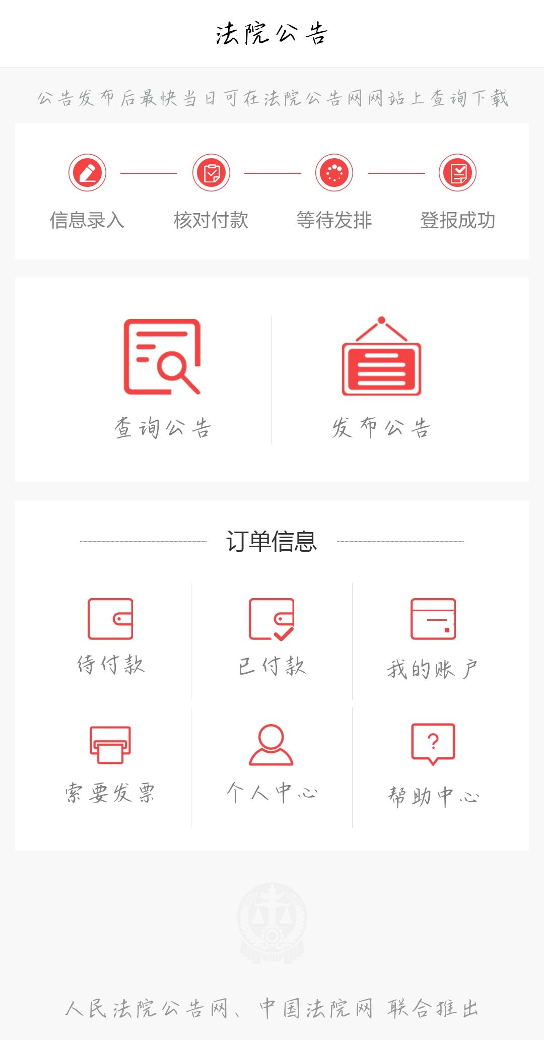 1、人民法院公告网和中国法院网联合推出 2、正规公告发布渠道 3、内置多种公告模版更新日志