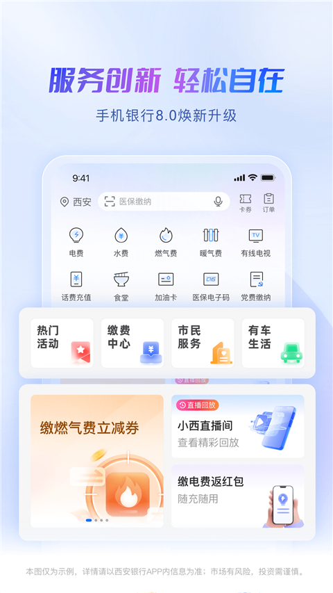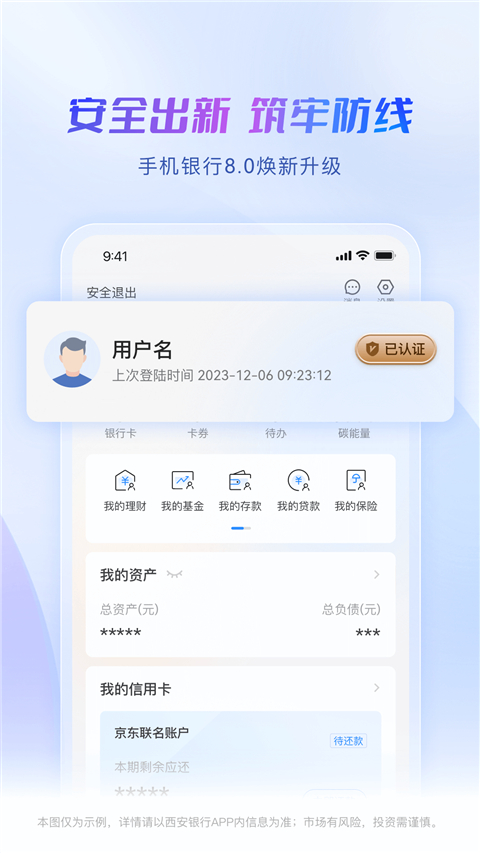 1、多重可靠的安全保障: 西安银行手机银行采用多种安全保护措施来确保您的账户资金安全。包括数据传输加密、超时自动退出、动态密码校验、限额控制等。 2、专业丰富的金融服务: 西安银行手机银行涵盖了日常营业网点提供的基本金融服务,包括账户管理、智能转账、储蓄理财、投资理财、生活缴费等功能,让您轻松掌握账户资金动态,随时随地进行财富管理。 3、丰富多彩的营销活动: 随着西安银行手机银行的推广,西安银行也将适时推出各类丰富多彩、奖励丰厚的活动,敬请关注移动银行公告或西安银行官方网站。常见问题