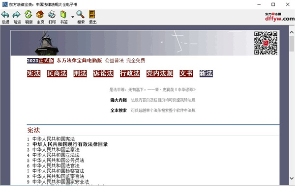 东方法律宝典电脑版是东方法律宝典第十七个版本,是一款法律法规电子版软件,其中收录法规7600余部,包含了全国人大常委会关于刑法、刑事诉讼法的七个最新法律解释,对废止的法规进行了特别标注,并链接新法规。东方法律宝典是学习法律用户最好的辅助,使用东方法律宝典,用户还可以在线免费进行法律咨询非常方便。东方法律宝典继续上一版本完全免费,无需注册,无限期使用,法规界面大小可调,页面文字可复制!欢迎有需要的用户下载使用。