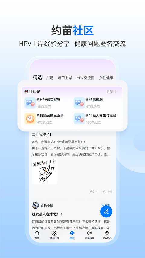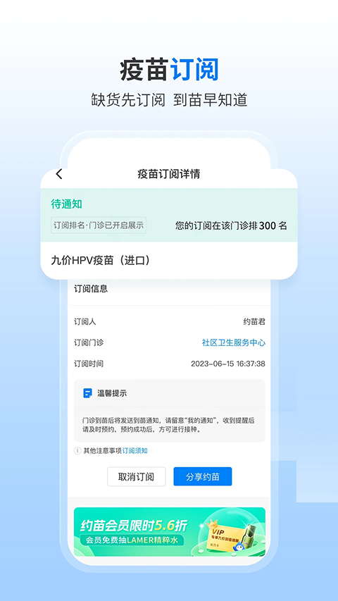 1、疫苗接种预约 用户可自主选择时间与门诊,预约成功后还有注意事项、接种留观提醒、接种反馈等全链条服务保驾护航。对于暂缺疫苗,提供“订阅到苗通知”服务,门诊到苗后将为订阅用户发送通知。 2、门诊主页 用户通过查看附近门诊,可以全面、及时的获知门诊服务信息与医疗资讯。 3、宫颈癌&乳腺癌免费筛查 提供“免费宫颈癌&乳腺癌筛查”线上预约服务,并对相关科普防治知识进行宣导。 针对暂未开通服务的地区,支持用户一键“订阅通知”,接收所在市两癌相关信息提醒。 4、健康科普 由专业内容团队与医生专家审核团队共同打造,覆盖疫苗及传染病全体系的健康科普内容。 5、健康体检 提供可防控疾病的相关检查/筛查预约服务,以及婚检、孕检、癌症专项检查等体检预约服务。功能介绍