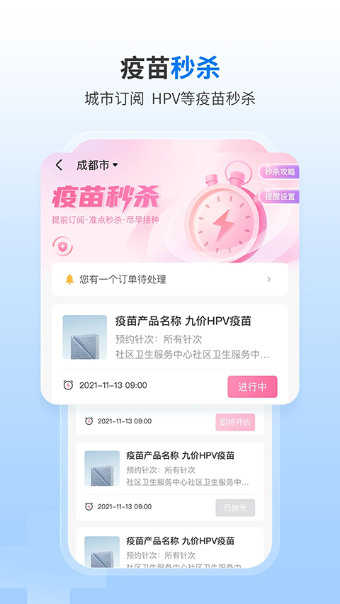 1.疫苗预约:支持HPV疫苗、新冠疫苗、流感疫苗、乙肝疫苗等成人及儿童全品类疫苗在线预约。 2.疫苗秒杀:稀缺疫苗在线秒杀,支持提前订阅到城市,秒杀之前贴心提醒。 3.疫苗订阅:稀缺疫苗约不到?先来订阅到苗通知,门诊到苗后通知预约。 4.线上微门诊:基于定位为您推荐附近门诊,轻松直达门诊各项服务,随时查看门诊通知&资讯。 5.健康科普:科普知识太烧脑?看约苗小编为您打造专业、有趣的疾病预防科普,简单易懂选苗无忧。更新日志