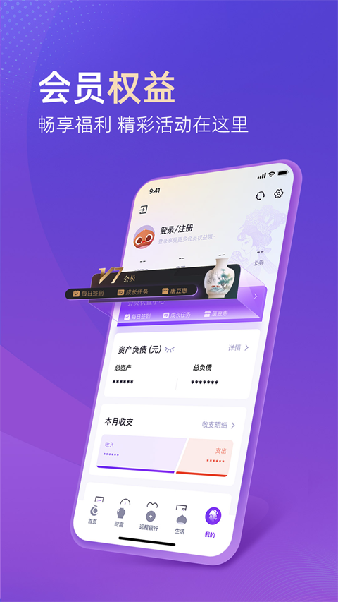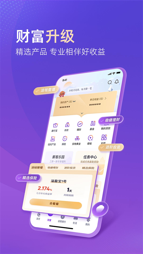 1、【设计精心,全新视觉体验】 全面升级设计语言,基于品牌色调,重新定义图标色彩,强调设计发展趋势,采用顶部通栏和双色极线性icon,提高留白率,核心功能上移,广告区域缩小,更大的间距较少操作干扰,为用户提供更加清爽的视觉空间,实现从形式追求功能到内容引导设计的转变,更加符合您的使用习惯。 2、【掌控随心,财富触手可及】 更加丰富的金融产品,更加智能的产品推荐,更加精准的产品筛选,为您带来更加自由的财富管理。清晰展示您所购买的各类产品收益情况,为您提供更直观的理财感受。 3、【生活贴心,权益无处不在】 丰富的生活缴费功能,让您不必再东奔西跑。新增“我的权益”模块,更加清晰的展示您所获得的权益、权益等级,并为您提供了红包、卡券等更加丰富的客户权益和精彩的优惠活动,各种福利轻松兑换。 4、【服务用心,资产一目了然】 新增账户和资产视图,展示全局账户信息,让您的财富一目了然。支持通过全局视角和卡视角不同维度的信息查看自身资产情况,并能够根据需要对账户使用权限灵活调整,为您带来更贴心的体验。 5、【牢记初心,关爱源自简单】 在标准版的基础上推出了简洁版,用户可根据需要自由切换。简洁版聚焦用户存、转、查等主要功能需求,使用更加清晰的界面和较大字体的设计,便捷操作一目了然,为用户提供更加简洁的使用体验。软件功能
