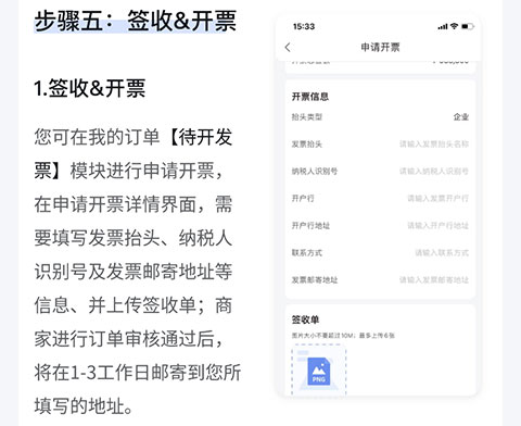 您可在我的订单待开发票模块进行申请开票,在申请开票详情界面,需要填写发票抬头、纳税人识别号及发票邮寄地址等信息,并上传签收单。商家进行订单审核通过后,将在1-3工作日邮寄到您所填写的地址。