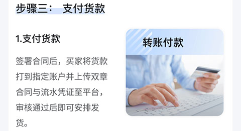 签署合同后,买家将货款打到指定账户并上传双章合同与流水凭证至平台,审核通过后即可安排发货。
