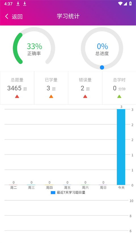 3、这时你就可以查看你的学题数、错题量和总学时了。