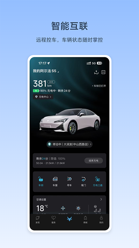 1、车辆状态:实时掌控车辆最新数据(续航里程,剩余电量,充电状态、充电电流,充电剩余时间等实时参数)。 2、用户反馈:您可以在此界面输入您对我们app的意见,我们将及时采纳和解决问题。 3、行车日志:能够掌握最近的七天的驾驶行为评分、轨迹等。 4、车辆控制:远程控制车辆充电和空调以及车门锁。 5、爱车体检:检测车辆健康状态,时刻让您了解爱车的健康状况。 6、位置服务:定位您和您的爱车的位置和距离,保护车辆安全。软件优势