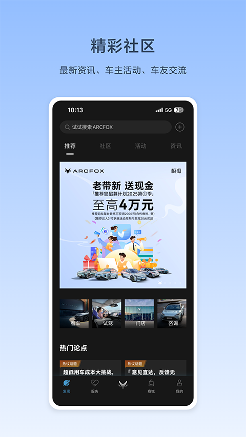 1、探索生活 车主活动、媒体评测、用车技巧,期待与您一同探索。 2、智能互联 远程控车,车锁/空调/车窗还能寻车哦。 3、愉悦商城 商城惊喜不断,快把喜欢的全都带回家。 4、遇见美好 美食、美景、自驾游、玩车用车,和志同道合的朋友们在一起。 5、在线购车 车型亮点、订购权益、金融置换,尽享你的专属服务。更新日志