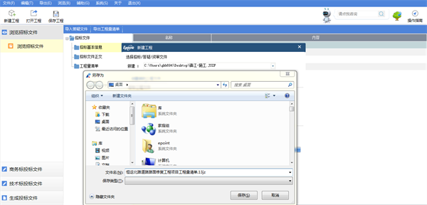 第三步、【创建新的工程文件】下方投标工程文件的【名称】是从招标文件中自动获取的,点击【路径】后方的【浏览】按钮,会弹出保存工程文件(*.etbp格式)的存放位置,请自行选择保存位置并牢记位置,点击【确定】即新建完成,进入投标文件制作界面。