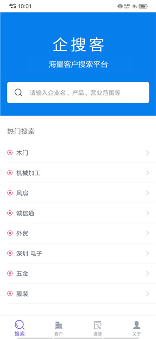 1、深层融合企客宝客户管理系统,可以将潜在客户一键同歩到企客宝 2、适用客户分类标识,早已导出来到手机通讯录功能 3、一键查看 1亿 公司 详细资料 4、给予了一键电销,适用通讯记录和音频统计分析 5、融合客服中心,完成强烈推荐顾客,管理方法顾客,及其联络顾客全部市场销售周期时间全闭环控制 6、遍布全国34个省份,7000多领域,发掘超出8000万 企业登记数据信息,处理公司数据孤岛问题 7、洞悉公司顾客价值及风险性,完成智能化荐客企搜客使用说明