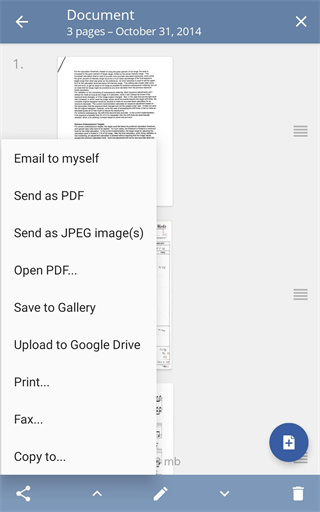 1、即时一阶亮度,旋转,色彩控制 2、自动文档边缘检测和透视校正 3、在像Dropbox的免费应用程序的其他应用程序(或Evernote的,Google云端硬盘,OneDrive应用等)打开的PDF或JPEG发送到云,或传真应用 4、通过云打印或其它打印应用打印 5、安排一个PDF页面上的多个收据或名片 6、“发邮件给自己”功能,快速的电子邮件 7、存储扫描之间复制页 8、电子邮件文档PDF,JPEG或PNG,或保存到相机胶卷 9、多页编辑:添加,重新排序和删除页面 10、超快速的处理(下每页3秒) 11、文件命名,应用程序和搜索内部存储软件亮点