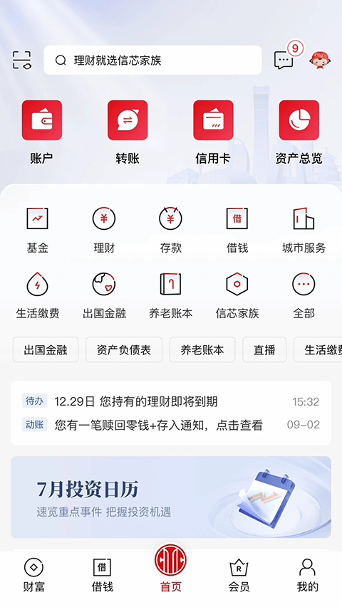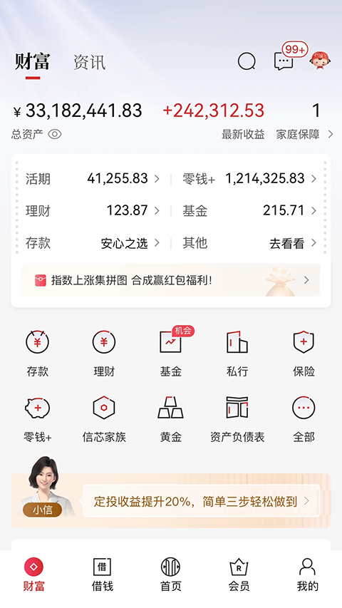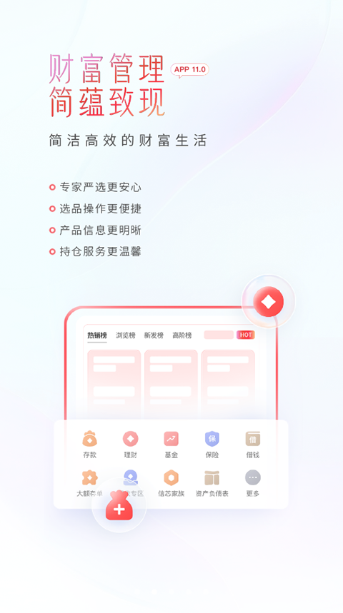 1、化繁为简的财富生活 专家严选更安心,选品操作更便捷,产品信息更明晰,持仓服务更温馨。 2、丰富多彩的会员活动 福利升级好礼遇,玩法升级更有趣,一站查看更便利。 3、多元客群服务全面展现 Z 世代服务再升级,资产传递安享财富,智能养老规划清晰。 4、无微不至的多场景陪伴 7x24小时随时陪伴,财富旅程专业陪伴,广泛触达综合陪伴,智能衔接协作陪伴,一户一服专属陪伴。 5、面面俱到的品质体验 账户管理更高效,待办事项更贴心,账单明细更清晰,资产分析更智能。常见问题