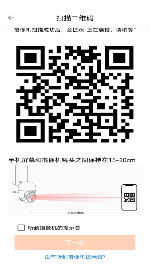 5、如果是摄像机4G连接方式,将摄像机开启扫描二维码。请将手机与后置摄像头保持15-20厘米距离,不要离开二维码界面,摄像机绑定成功后会自动跳转。