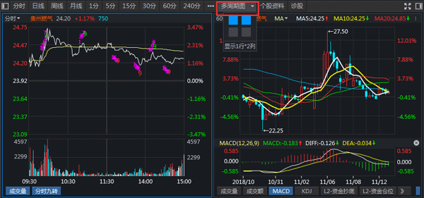 多周期图:点击K线图上方的“周期图”,默认出现的是分时、15分、30分、60分的四图,点击每个版块左上角“更多”的小倒三角图标,可以更改当前板块的显示内容。