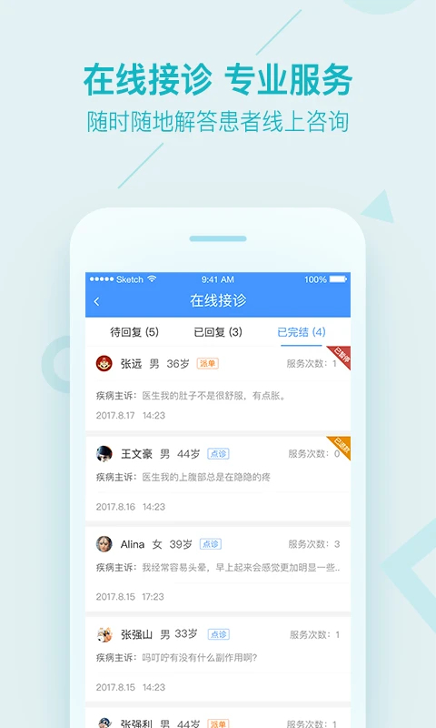 1、在线接诊 开通服务后,患者可在用户版APP中看到医生主页和服务内容,可随时下单咨询。 2、预约面诊 医生可为需要的患者提供预约线下面诊服务,方便用户到您的门诊就医。 3、患者病历审核服务 用户订购在线问诊服务后,医导会帮助患者建立和审核病历资料,便于医生进行后续接诊服务。 4、患者管理和档案查看 医生可标记重要患者以及为患者添备注信息,可随时查看已接诊患者的档案和历史就诊记录,便于对患者继续拿给你记录和追踪。 5、医生专属名片分享 医生注册成功后将获得专属名片和二维码,患者当面扫一扫,方便患者通过用户版APP快速找到医生和订购服务,树立医生品牌形象。软件特色
