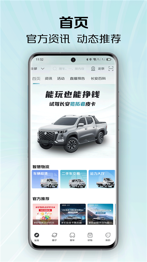 1、登录之后点击下方中间的【爱车】,你先左右滑动选择想要预定的车辆,有长安凯程V919、长安猎手以及睿行MBOEV。其中长安凯程V919支持免费试用哦!