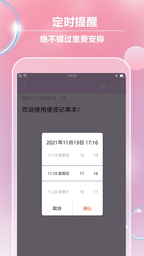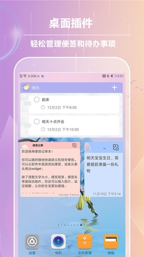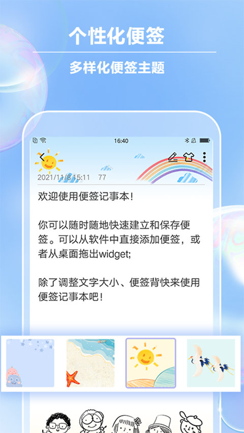 1.你可以在桌面轻松管理便签列表,无需进入app,便签内容桌面可直接查看。 2.还可以为便签设置皮肤,精致海量的便签皮肤,让每一份便签都与众不同。 3.你可以记笔记、写日记,扫描文档,添加手绘,添加图片,待办管理,购物清单等。 4.还可以在手机桌面轻松管理待办事项,设定好时间,再也不用担心忘记重要事项。 5.便签中可快速插入各种图片,还可以插入扫描文档图片,天气,时间,位置。手绘功能让你随时记录构思,快速记录场景,发挥无限创造力。 6.使用云备份功能,再也不用担心便签丢失。一键分享,可轻松将笔记以文字或者生成图片的方式分享给你的好友。软件功能