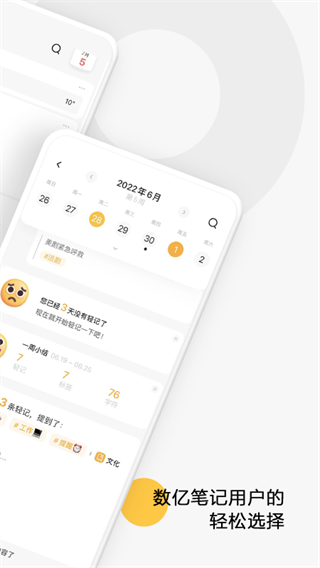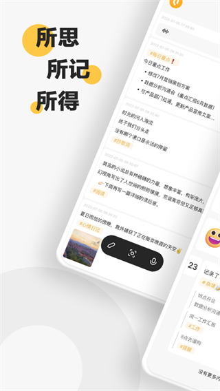1、打开摇一摇 即开即写 打开「轻记」App,无需点击,轻轻“摇一摇“即可记录生活精彩瞬间。你可以选择: 文字输入:手动输入文字或添加图片来快速记录一条图文轻记; OCR识别文本:通过实时拍照,将图像内的文本识别出来并添加到当前的轻记中,可以在你不方便打字的时候,或需要将纸质内容转化成文本格式时快速记录; 语音记录:使用录音功能,快速记录语音轻记,当然你也可以将语音转写成文本进行保存。 2、安卓桌面组件 一键记录 轻记在安卓端可以添加小组件,你可以添加你喜欢的样式: 创建轻记:帮你快速记录灵感; 轻记回顾:随时随地回顾,激发出新的灵感与感悟。 这样不打开应用,首屏点一下就能快速使用「轻记」,让记录、效率提升变得更简单、有趣! 3、分级标签 由点成线 「轻记」采用多级标签系统,通过多级标签系统,你可以在「轻记」中搭建更立体的知识体系,也可以快速检索,更加便利和高效,让碎片化的记录形成体系,让你从此告别分类焦虑。 创建多级标签:“/”就可以生成分级标签,例如“#旅行计划/出行/住宿/美食”就是一个四级标签; 一个功能多种用法:你可以将标签添加到笔记的任意位置,除了是标签,你还可以把它当作内容的一部分或是标题来使用。 除此之外,也可不手动添加标签,由系统为你智能提取,内容足够丰富之后标签自然而然生长出来。 4、跨平台记录 多端同步 不止在移动端,你还可以在桌面端和微信里记录「轻记」。「轻记」App与「印象笔记」中的「轻记」入口及「印象轻记」微信公众号数据打通,在三个平台你都可以实现沉浸式记录,你可以自由选择当下最便捷的记录方式。而且,不管你在哪个平台记录的灵感,都能轻松汇聚到一起,实现记录内容的多端同步。印象轻记app手机版优势