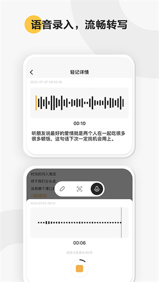 1、随心记录 「轻快记录」 碎片信息轻松、随手记下。闪现的灵感、每日轻日记、随笔摘抄、备忘录……轻轻一点,离线记录,随想随记,随心所欲。 「形式丰富」 不止记录文本与图片,更可直接录入语音,OCR快速识别文本,多样化的记录方式,适用于多重记录场景,令记录更加灵活高效。 2、心历回顾 「记录回顾」时间轴视角回顾轻记内容,热力图组件直观呈现过往记录;每一次用心的记录都历历在目,激发出新的灵感与感悟。 「习惯养成」人性化提示记录,特殊时刻趣味彩蛋…让记录成为一种习惯,收获记录复利。 3、知识管理 「标签归类」多级标签体系,可对内容进行清晰归类;不仅如此,多级标签更能让您的轻记检索更加便利和高效。 「知识体系」对轻记录的内容进行智能化归类和聚合,将碎片化记录生成结构化信息,内化为知识体系与能力。 4、多端分享 「精彩分享」一键生成轻记卡片,分享给好友、同事、圈子,让思想碰撞,唤醒新思维。 「多端同步」轻记APP、印象笔记桌面端、微信公众号,支持多端记录及同步,自由选择当下最便捷的记录方式。轻记录下的内容,更可用印象笔记拓展创作——轻记录,大用途。印象轻记app软件功能介绍