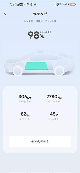 车主通过软件还能实时查看到电池的使用记录,以及还能走多久、电池的温度、总行驶里程等。