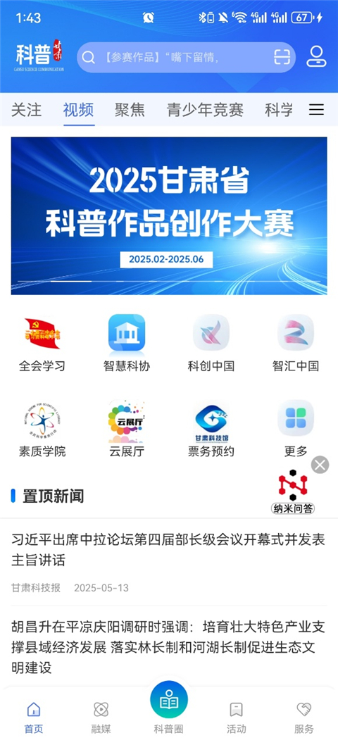 1、以“众创、严谨、共享”为宗旨:鼓励用户参与科普创作,共同分享和传播科学知识。 2、以“甘肃省科普资源库”和“科普中国”为基础:拥有数十万条涵盖“科学思想、科学家精神、前沿科技”等主题的优质科普资源。 3、丰富的交互方式:通过视频、文章、竞赛等多种形式,为用户提供智慧、便捷、活泼的科学技术传播平台。更新日志