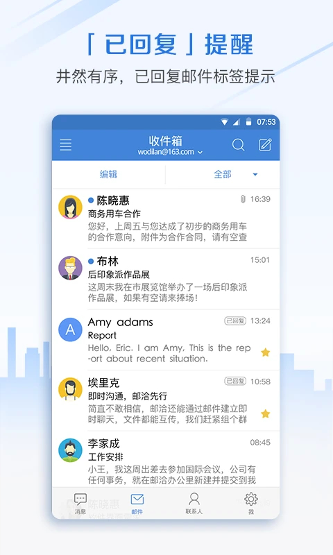 1、智能管理,轻松搜索 支持即刻搜索服务器上的邮件,按照主题、收件人、发件人搜索。 智能突显常用联系人,自动记录往来联系人,同步企业邮箱组织架构。 联系人详情界面支持查看往来邮件。 2、支持所有邮箱 支持腾讯QQ/网易/新浪/搜狐/阿里/雅虎/126/139/189/Gmail/hotmail/foxmail/outlook等各类个人邮箱账号。 支持三五互联/网易/腾讯/阿里云/263/中资源/亿邮/新网/万网等各类企业邮箱账号。 完美实现国内直接登录Gmail,更稳定、更安全的体验。 一键登录,智能配置,一站收发,流畅切换,随心管理。 3、二十年企业服务经验 邮洽由上市企业三五互联控股,基于其二十年企业信息化服务经验用心打造。 十年实时Push推送技术积累,确保新邮件/消息稳定、极速,瞬时提醒、绝不遗漏。 完美接入三五互联OA办公系统,轻松搞定事务审批、外勤签到、公告等事项。 全方位安全加密,保护您的信息安全,支持手势密码。 4、信息多端同步,引领办公轻沟通 事项需要讨论,无须邮件往来,只需对方邮箱地址,即可一键发起聊天,无需验证。 手机与电脑端消息完美同步,聊天记录永久漫游,支持超大文件传输。 支持与内外部人员即时通讯,语音、图片、文件(word/wps/ppt/pdf)自由互传。 对方暂未安装邮洽,消息将自动集合转为邮件传达。邮洽邮箱手机版使用教程