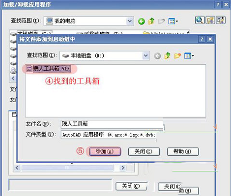 (2)点击对话框上启动组里的“内容...”,点“浏览”,找到工具箱,点“添加”,把工具箱添加进去,关闭对话框