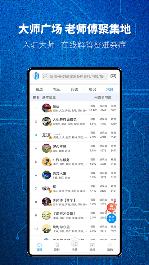 1、只需要一分钟的时间,选择您擅长或关注的品牌,以及常用的资料类型,我们会有针对性的为您提供服务。 找资料、专业问答、大师计划、学知识等各处,我们都会根据您关注的品牌,来为您匹配相关的内容,这会为您节省很多时间。 2、我们在首页将问答、资料、知识、笔记、大师等中的优质内容,做了集中展示,每天都有很多看点,方便您有事没事,都能来逛逛看看。 3、重新设计和优化了全局搜索,包括各种类型的资料、汽修人中的问答、各种案例视频技术通报笔记等,都可以通过搜索框一键搜索,一搜即达。 4、经过配置后,您常用的品牌和资料类型,都在找资料主页等您。您可以按类型查看,也可以按照品牌查看。我们每天都在为您更新各种最新资料,您在找资料主页都能看到。 5、专业问答提问后,可以点击右上角补充提问或者补充解决方案,补充解决方案后,可以获得刮奖机会。同时,补充的提问或者解决方案,会呈现在问答详情页底下。更新日志