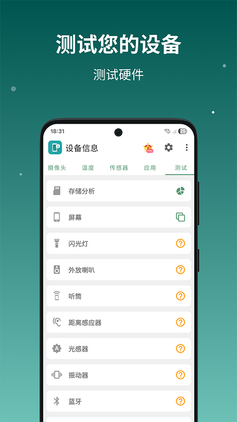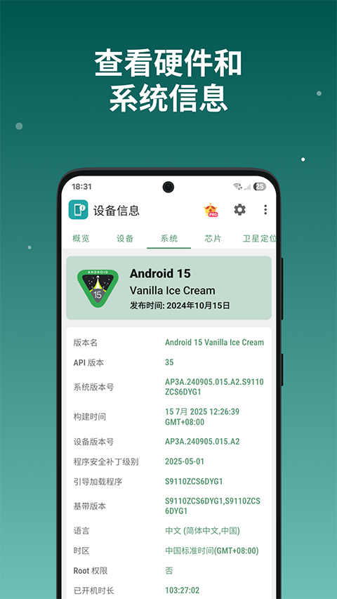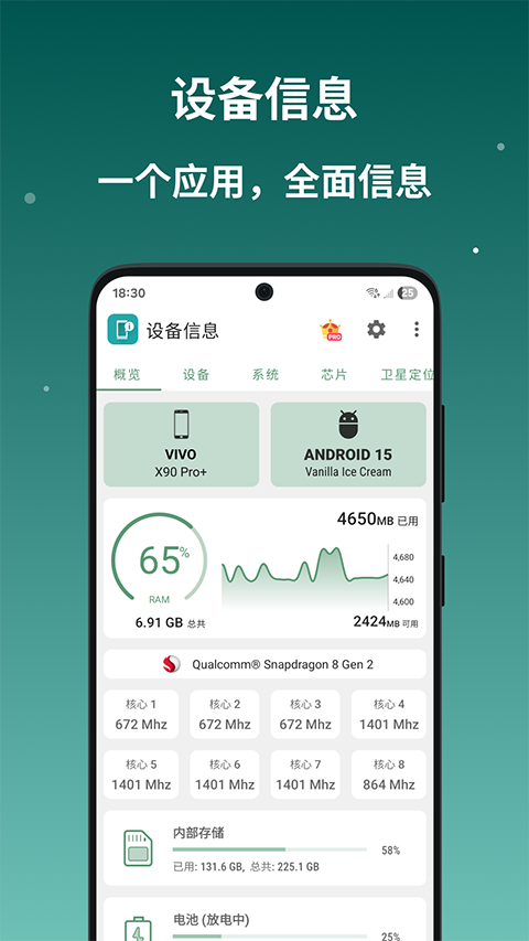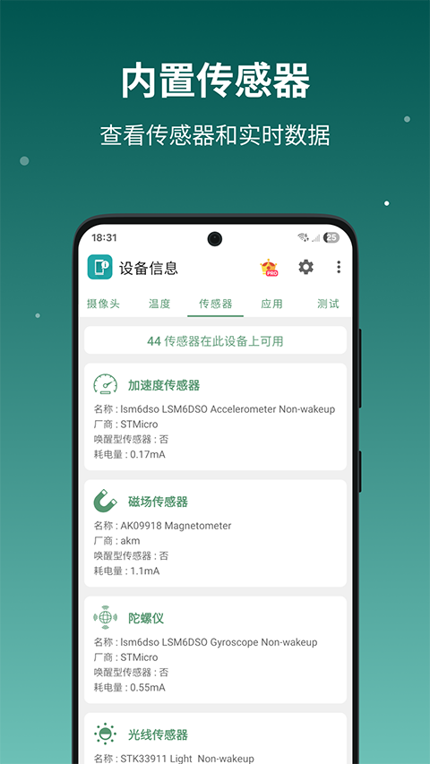 设备信息为用户提供了以下Android设备信息,分为以下几类。 1、Android设备信息、电话信息 生产商名称、型号、主板、硬件、序列号、Android ID、屏幕分辨率、引导加载程序、架构平台。 2、操作系统信息 版本名称、API级别、版本号、构建时间、指纹、Java虚拟机信息。 3、实时传感器信息(加速度,陀螺仪,计步器,磁力,步进检测器,重力,运动,旋转,倾斜,手势,唤醒等) 有关每个传感器的可用信息:传感器ID、传感器名称、传感器类型、供应商、解析度、耗电量、最大范围、是否为动态传感器、是否是唤醒传感器、报告方式。 4、CPU和处理器详细信息 频率、核心数、RAM(总计,已用和空闲)、处理器、CPU架构、硬件平台。 5、电池信息 电池容量、电池类型(锂聚合物,锂离子,镍镉)、电量来源、电池温度,电压,电量,健康状况。 6、硬件温度 CPU、电池、usb端口,每个地方的问题都能知道! 7、网络(WiFi和移动网络) 网络ip、网络ssid、信号强度、IPv6地址等等关于网络的信息,一目了然! 8、相机 支持的分辨率、可用的像差模式(快速,高质量)、闪光灯、补偿范围、场景模式(HDR,人像,夜间,聚会,雪景,运动等)、格式(JPEG,PNG) 9、内部存储、系统存储、外部存储 内部存储器、文件系统、总的APK可用存储空间。 10、显示 屏幕、屏幕尺寸,物理尺寸,默认方向,宽度,高度,刷新率,名称、密度、显示dpi,PPI,信息,逻辑密度,比例密度、解析度、可用宽度,可用高度,与密度无关的宽度,与密度无关的高度。 11、GPU和RAM GPU设备名称、GPU设备供应商、GPU设备版本。 12、应用程序详细信息 活动,服务,广播接收者,权限,查看AndroidManifest.xml,可以看到应用程序的所有详细信息。更新日志