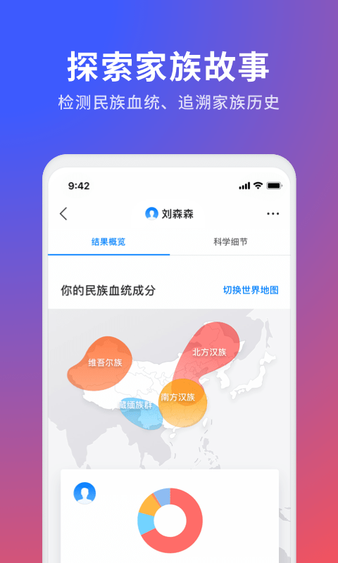1、家庭检测,产生更大价值 家人一起进行基因检测,可生成家族遗传树?,后代遗传情况一图看清 2、探索你的祖源 我们祖先的每一次选择,无论是狩猎还是采摘,选择与谁结婚,甚至连选择早餐吃什么,都决定了现在的你和我 3、了解遗传风险 我们的基因来自于父母的遗传,有的很美,有的存在暗藏的风险,打开基因的密码,了解疾病风险的遗传 4、发现运动潜能 个性化的运动方式,建立在对体质的科学分析。我是更适合长跑还是推举?无须舍近求远,自己的基因就可以回答 5、找寻独特自我 独特的基因造就独特的我。我生而如此,但我为何如此?基因只是一个小小的动作,但我已经大大的不同 6、营养补充&用药建议 我们的身体需要什么?我们的身体抗拒什么?基因会影响我们对营养的代谢与需求,基因会影响药物的反应与效果 7、自建实验室 我们拥有国内DTC基因检测公司唯一自建专业实验室,并已获得临检所批文。从DNA提取到数据分析,整个流程在自建实验室完成,确保数据准确性及保密性 实验采用与美国赛默飞联合定制的基因检测芯片,70万+位点专门针对中国人群,是目前国内检测位点最多的定制芯片软件亮点