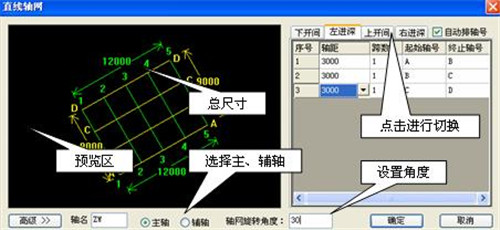 【调用同向轴线参数】:如果上下开间(左右进深)的尺寸相同,输入下开间(左进深)的尺寸后,切换到上开间(右进深),左键点击“调用同向轴线参数”,上开间(右进深)的尺寸将拷贝下开间(左进深)的尺寸。
