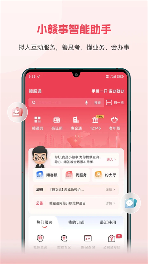 1、“约”:可以预约办理事项。如在线预约燃气上门服务,只要燃气公司受理了,就可坐等服务,真正实现“一次不跑”。 2、“看”:依托电子证照系统,可以在线申领查看身份证、驾驶证、社保卡、结婚证、离婚证、律师证等电子证照,并能运用到相应办事场景中。通过对接赣南日报、赣州广播电视台移动端,还可以浏览阅读最新资讯。 3、“缴”:对接“赣服通”统一支付平台,在办理缴费业务时可在线支付,如缴存房屋维修资金、非税缴款、交警罚没等。 4、“查”:与省级用户体系打通,依托统一身份认证系统,实现一次注册登录,即可查询个人社保、医保、公积金等基本信息,还可查询办事指南和办件进度。 5、“办”:设置了个人办事、法人办事板块,便民服务事项和政务服务事项都可以在线办理。软件亮点