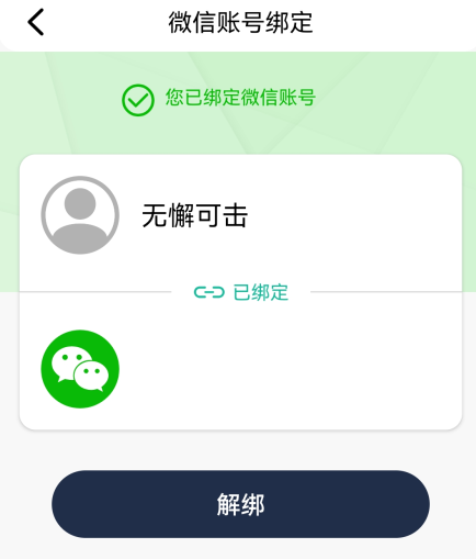 4、再次跳转回软件里,就会显示您已绑定微信。想要解绑的话直接点击下方的【解绑】就可以了。