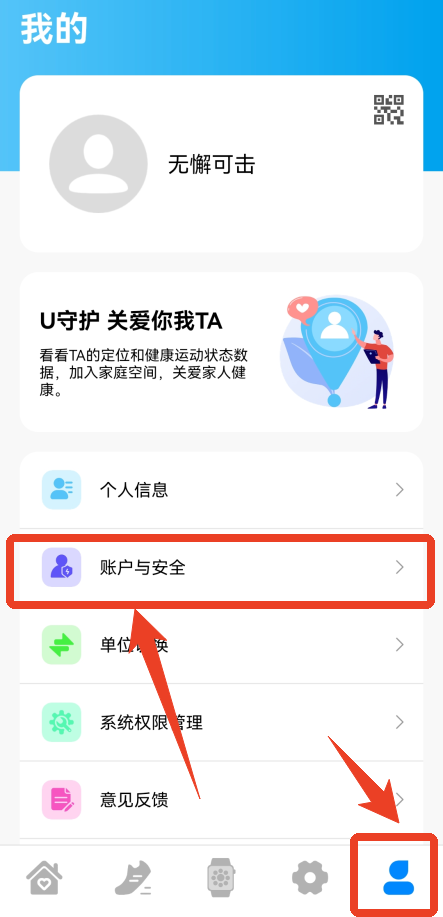 1、首先点击最下方最后一个人形状的选项,在点击【账户与安全】。