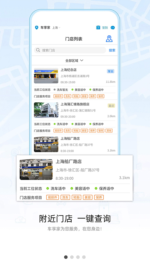 4、选择门店,可以查看到离你最近的门店,可以对车进行保养,洗车等;