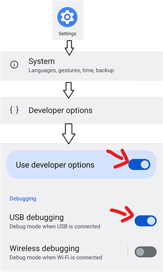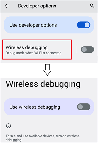 通过无线调试启动适用于 Android 11 或以上版本。这种启动方式无需连接电脑。由于系统限制,每次重新启动后都需要再次进行启动步骤。 一、启用无线调试 在网络上搜索如何为您的机型启用“开发者选项” 启用“开发者选项”和“USB 调试”