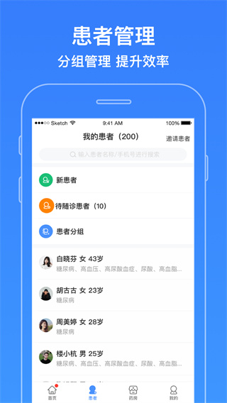 1、优化群发功能,消息列表更清晰。 2、增加详细的糖化血红蛋白的数据记录。 3、优化通讯录排序,查看更方便、搜索更便捷。 4、增加病人管理周报,帮助医生更好的管理患者。软件特色