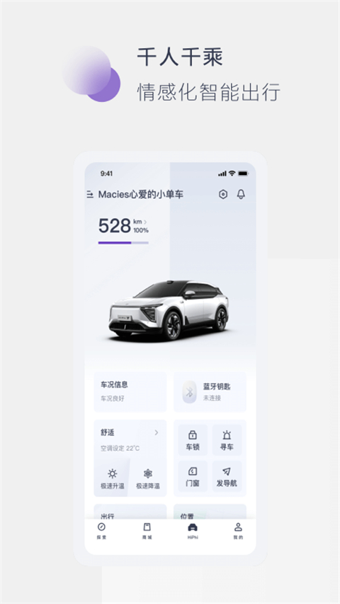 新增: - HiPhi Y「车控」增加后窗除霜功能,远程即可操作,冬日出行更便利; - 「车控」新增英文显示,选择更多样。 优化: - 「遥控泊车」泊出方向显示视觉优化,操作更明晰; - 修复若干已知问题。