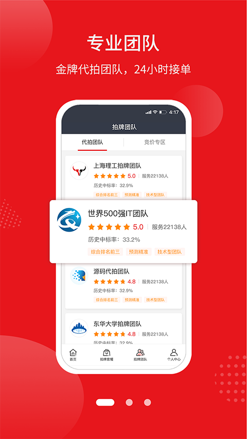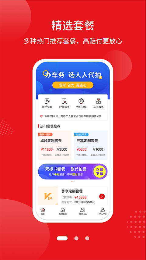 【低价格 高赔付】 1、价格低至5000元,不中赔付7000元。 2、去除中间黄牛,直接对接拍手,中标率常年在行业稳定领先,大平台靠谱。 【百里挑一的精英团队 24小时接单】 1、500多个团队申请入驻,只有20个团队通过考核入驻平台,低于5%的考核成功率。 2、所有申请入驻的团队必须经过至少连续3个月的中标率、实地考察等严格的考核流程。 【先行赔付 拍中付款】 1、拍中沪牌后再付款。 2、拍不中平台担保团队付赔付金。 【智能推荐 车主服务】 1、多种热门精选套餐推荐,更懂您。 2、沪牌选号、年检代办、外牌转沪牌等一站式服务让您更省心。 【双标书下单 更优惠】 1、 专属化定制策略。 2、 中标率翻倍,不中赔付翻倍。 3、 拍中只收取一张代拍费。人人代拍平台App五大亮点