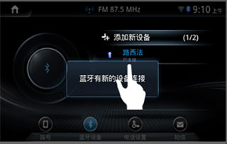 4、蓝牙配对后,车机会弹出“蓝牙有新的设备连接”弹框,并且出现手机蓝牙名称和“已连接”字样,即蓝牙连接成功。