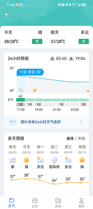 用户点击屏幕下方天气,即可进入天气界面,查看最近几天的天气,往下翻还可以查看生活指数。