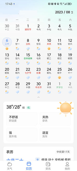 用户点击下方日历,即可查看日历信息以及天气信息。