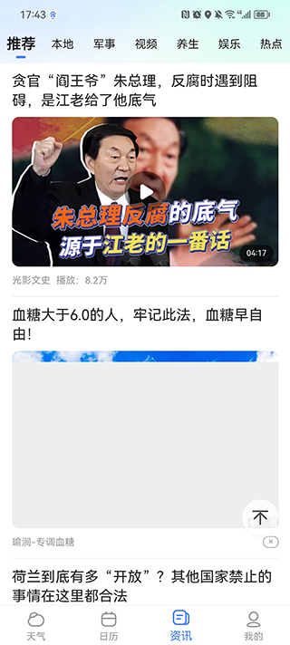 用户点击下方资讯,可以查看推荐、本地、军事、养生等资讯。