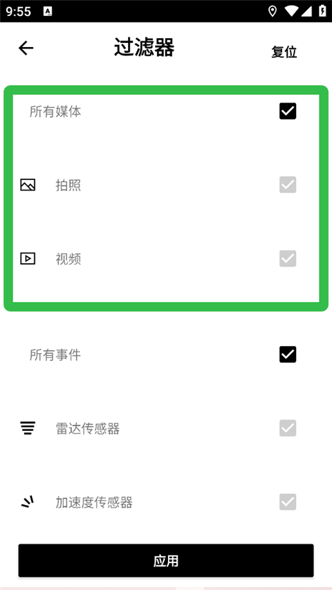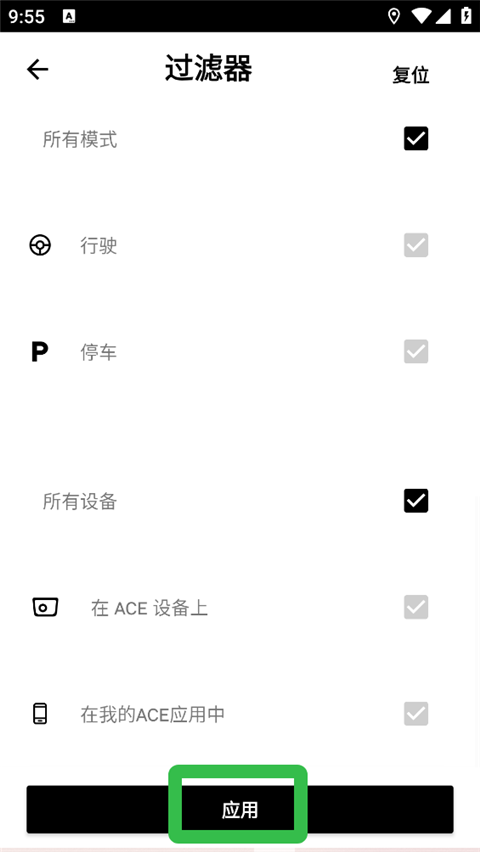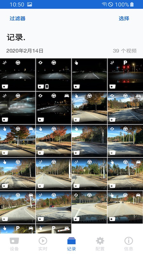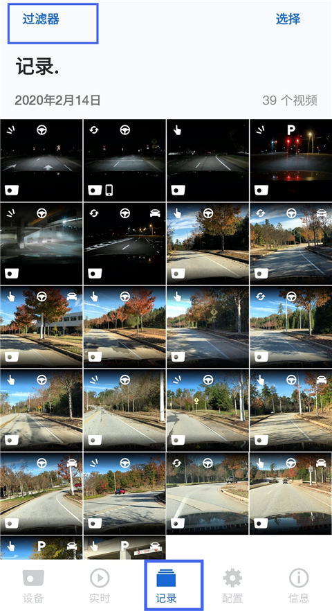 1、打开宝马Ace2.0行车记录仪app,进入【记录】页面,点击【过滤器】。