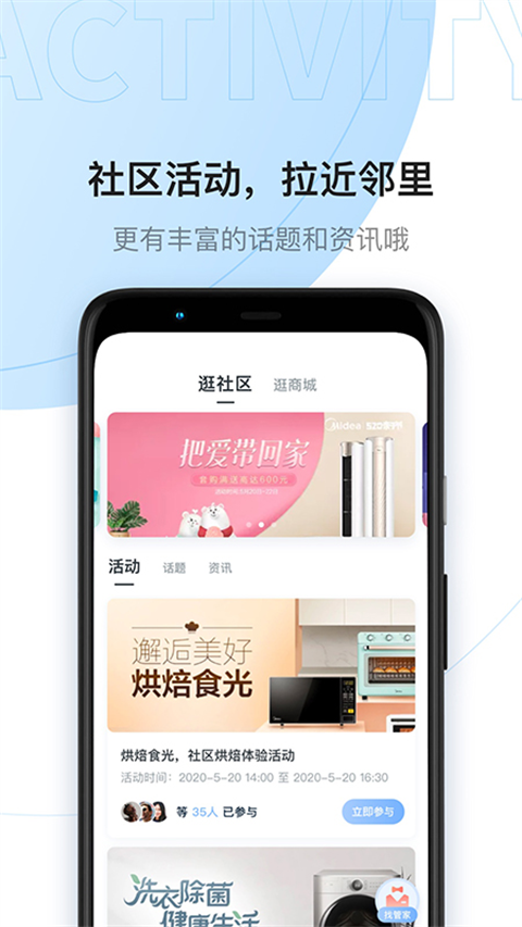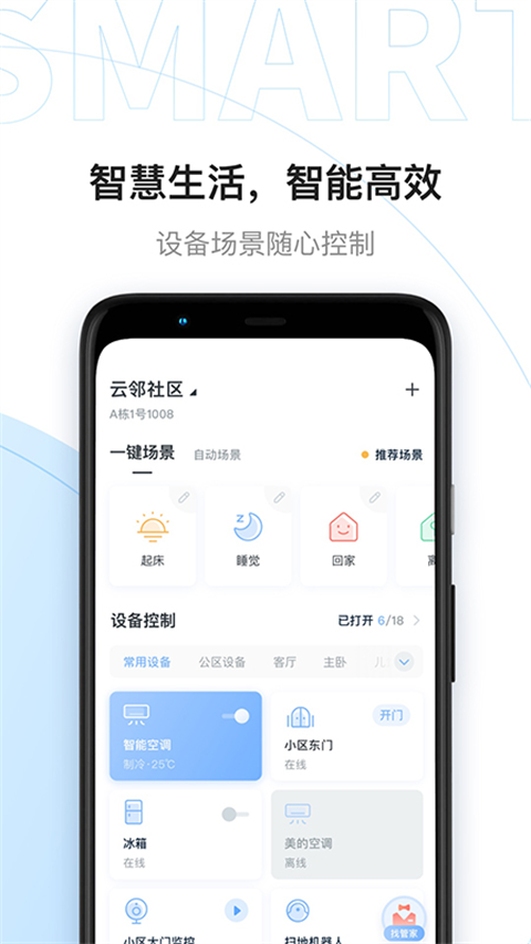 1、全产业链资源禀赋 传承美的科技基因; 依托美的控股在多元领域布局的产业协同优势; 共享美的体系内在资源禀赋。 2、全域智慧服务生态 以AI智能化手段、技术,借助物联网和大数据; 贯穿全域全场景服务生态,提供智慧空间服务。 3、全周期智能化服务 自主研发开放式智慧生态平台,通过一个APP; 即可掌控智能家居及智慧社区系统,并全面兼容第三方产品应用及服务; 实现智慧生活全场景互联。 4、全场景增值服务 搭建客户消费升级的360°生活全场景; 以社区作为私域流量入口,整合多方资源; 扩展社区服务的内涵与外延,激活社区服务生态。 5、全龄段社群运营 围绕“和”、“智”、“美”、“乐”、“趣”五大主题; 以“美管家”为纽带,以云朵之家共享空间为平台,组织业主兴趣社群; 打造全龄乐活和美社区。美的云邻社区App亮点