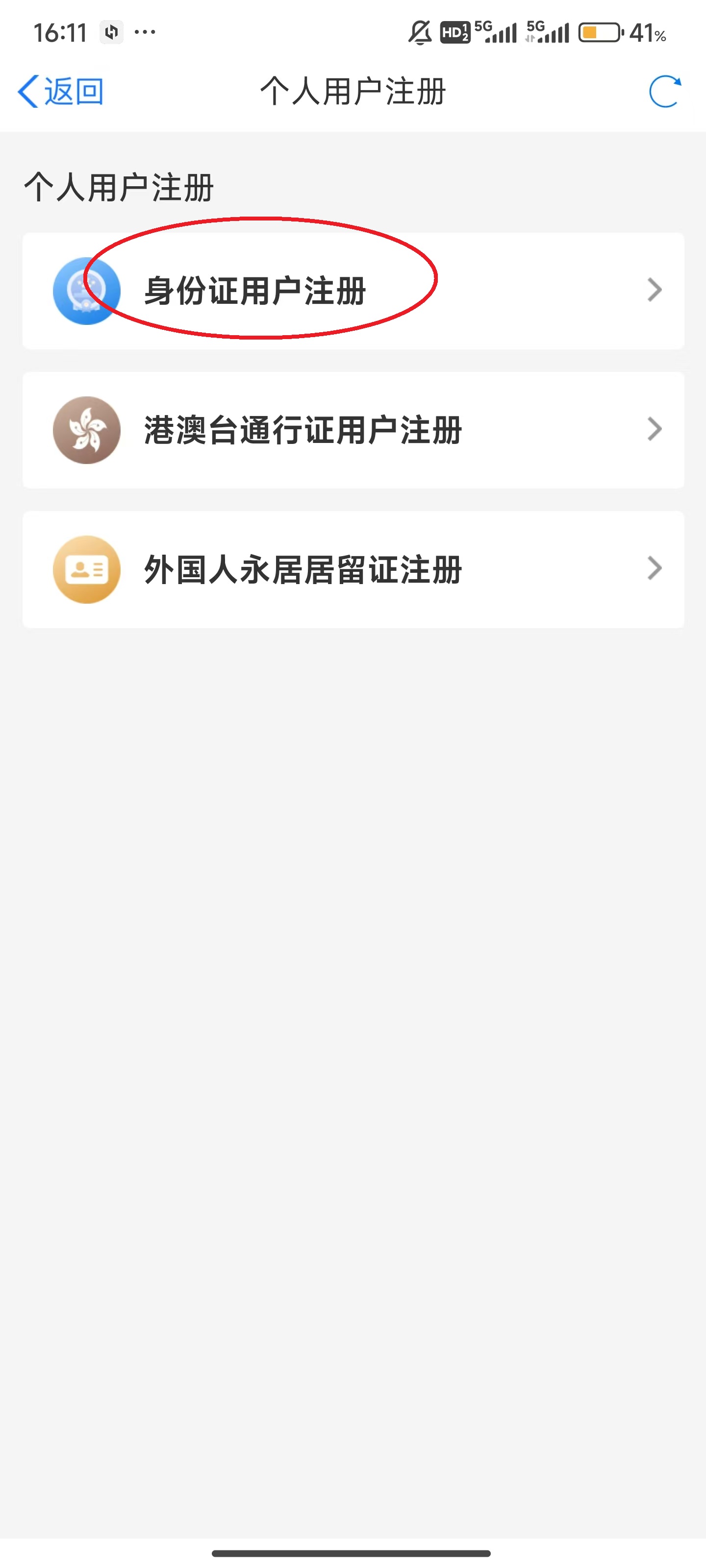 3、选择“身份证用户注册”,当然,港澳台和外国人就选择相应选项。