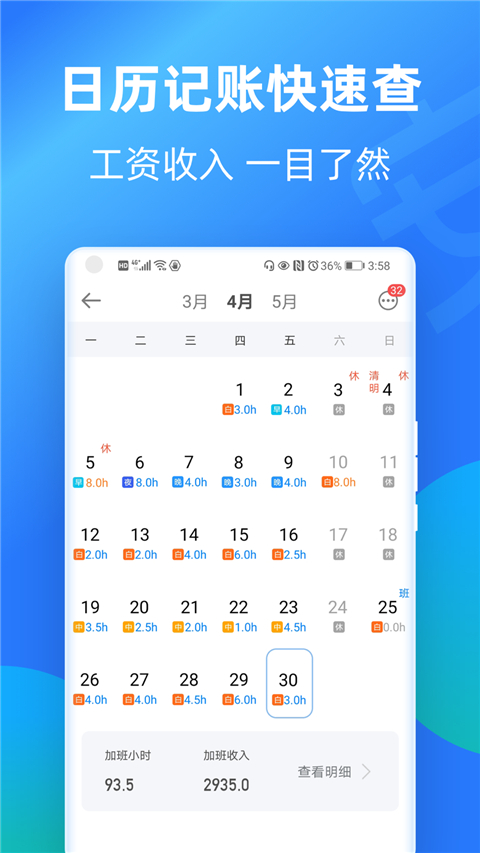 1、快速准确记录您的加班时间 2、记录加班时间后,帮您自动计算加班工资及当月总工资 3、支持批量记加班,一次可记多天,用起来更方面 4、快速备注上班班次,再也不会因为忘记要上班而错过约会 5、记录加班支持三种计薪方式 (1)记加班模式,超出5天8小时才算加班的工友使用此模式 (2)小时工/临时工模式,按照工作小时数计算薪资的工友使用此模式 (3)综合工时模式,每月超出168小时才算加班的工友使用此模式 6、工友可自己选择建立个人记工本、班组记工本,便捷处理建筑工地记工天、记工时、工地记账、建筑工地考勤等工地管理问题,促力为建筑工友提供高效办公服务,体验在线记工天记工时方便安心记加班APP如何记加班