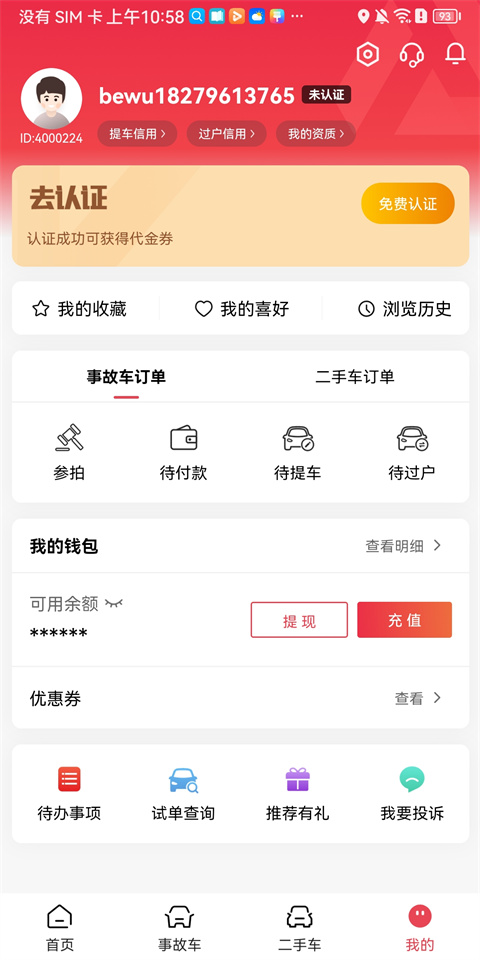 6、接着等待一段时间就可以看看车辆有没有竞拍上,点击我的,点击试单查询;