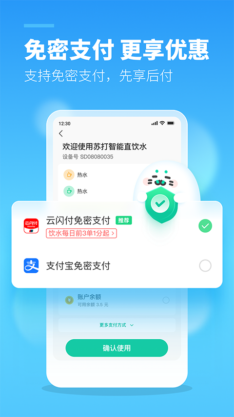 1、免密支付,享受更多优惠。 2、功能齐全,为你带来更多服务。 3、直接在手机上就能扫描打水,方便又快捷的服务。 4、用户可以随时查看附近的设备,扫码取水,在线支付。苏打校园让学生更容易喝水。 5、通过平台可以享受更多的优惠,可以随时查看附近的设备。可以通过扫码取水,手机快速付费。软件优势